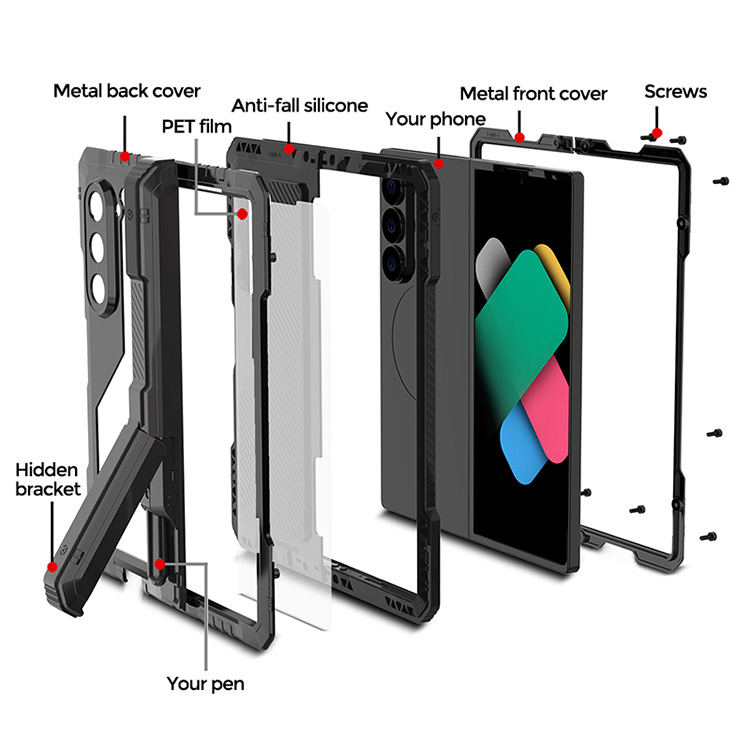 [All-Round Protection] The Samsung Galaxy Z Fold Case with s pen holder built in PET Screen Protector(NOT Glass), High transparent and touch sensitive, protect your front screen of Galaxy Z Fold from scratches. The Raised lips keeps camera lifted to prevent your lens from bumps, collision and scratches. The metal case is full coverage design, dust-proof and anti-scratch, it will also provides a daily protection in your life.
