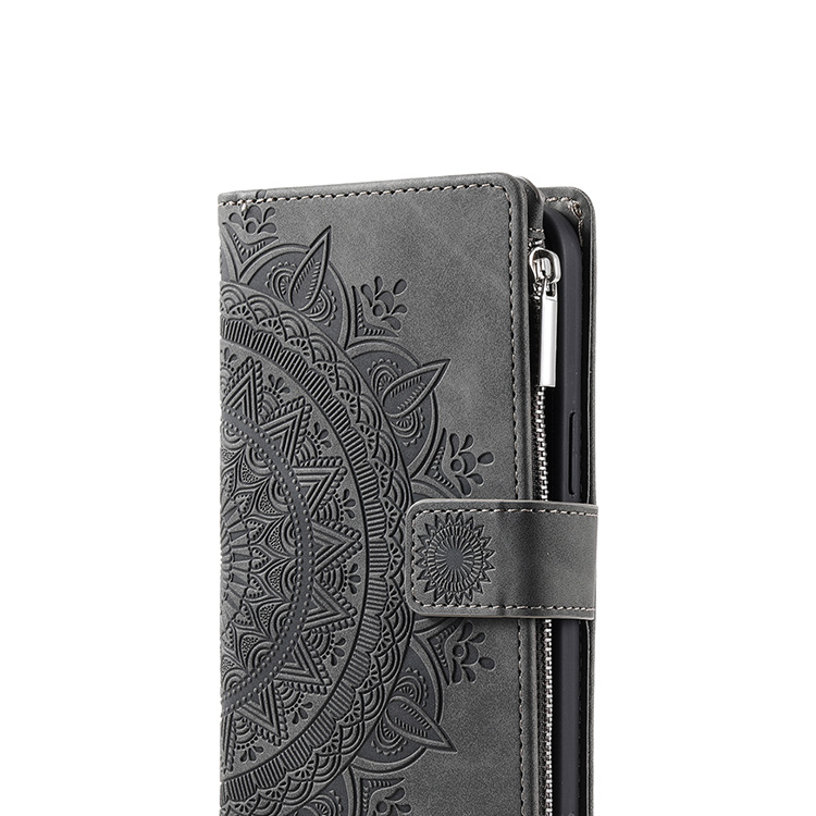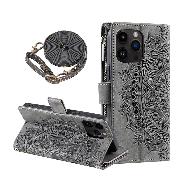 ODDRUN Casebus Flip Wallet Phone Case, Leather, Mandala Floral Embosssed Design, Magnetic Folio Zipper Card Holder, with Shoulder Strap & Wrist Strap