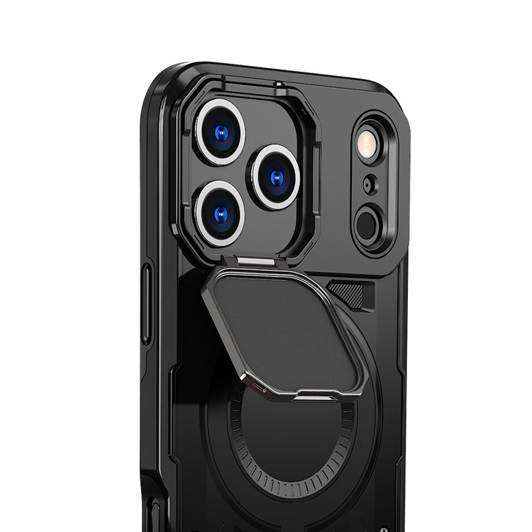 [Metal Camera Stand] The case comes with a sturdy zinc alloy lens mount that is adjustable from 0-130° and doesn't slide easily, keeping your lens clean while eliminating the need for additional customized lens protection film.