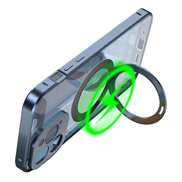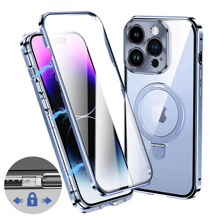 Casebus Etui pour téléphone portable compatible avec MagSafe, support métallique, pare-chocs magnétique en aluminium, verre trempé double face et protection de l'objectif de l'appareil photo en PC, housse pour kickstand