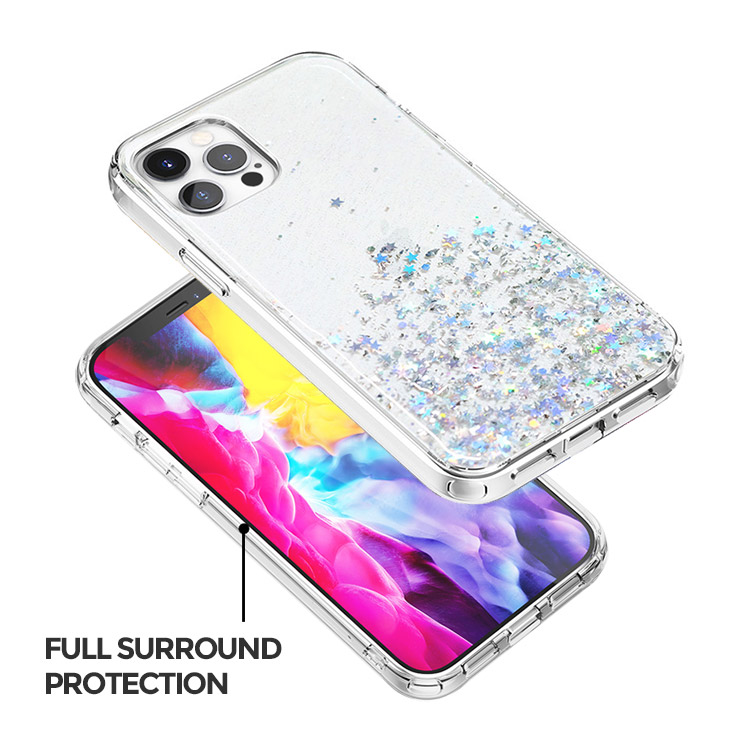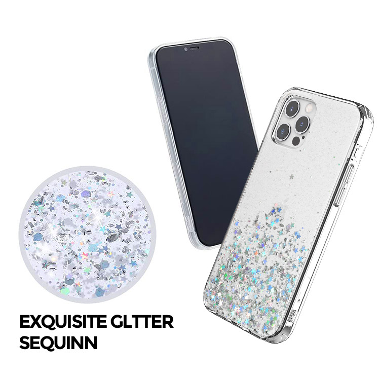 I love this case it’s light weight yet has sparkle. Unlike other sparkle cases this one doesn’t have water in the back it’s glitter infused into the plastic. Don’t mind the scratches it’s the protective clear layer on the glitter also the thin layer of the case permits you to utilize the wireless charging apple station.