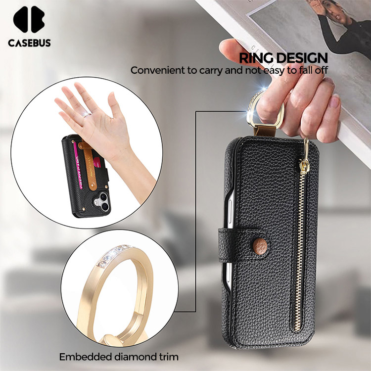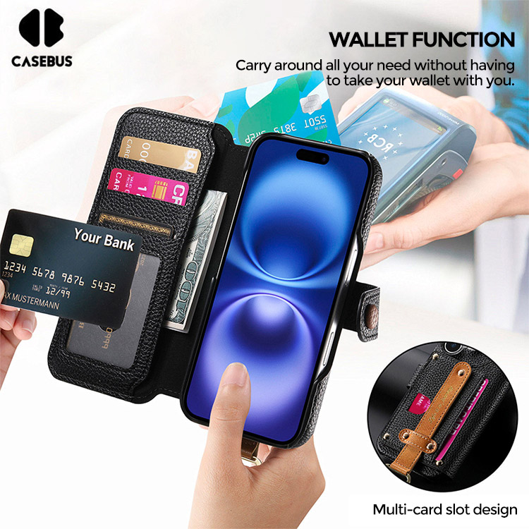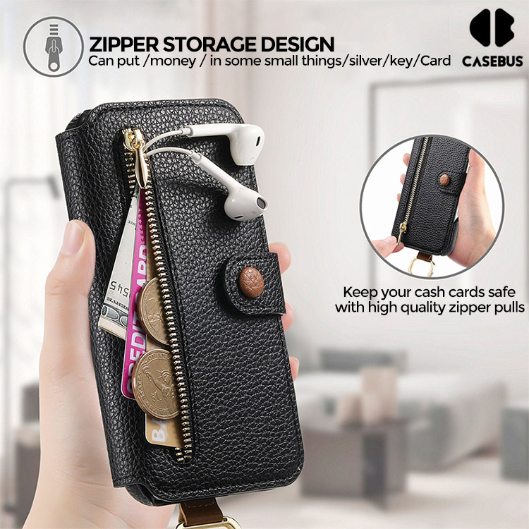 Casebus Zipper Flip Wallet Phone Case, Premium Leather, Magnetic Closure, with Card Slots & Detachable Lanyard Strap
