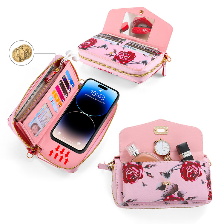 [Multi-función] 2 en 1 diseño de cartera funda de cuero con 14 ranuras para tarjetas, 3 monedero, 1 billetera con cremallera, 1 hebilla de gran capacidad, 1 pulsera, 1 correa crossbody, para mantener su tarjeta de identificación, tarjetas de crédito, monedas, dinero en efectivo y otras cosas. Haga su vida y el trabajo más conveniente, puede satisfacer sus necesidades al aire libre durante todo el día. Medida de la cartera aprox 19.2x10x6cm (L x W x H). Correa de Crossbody: unos 150 cm de largo.